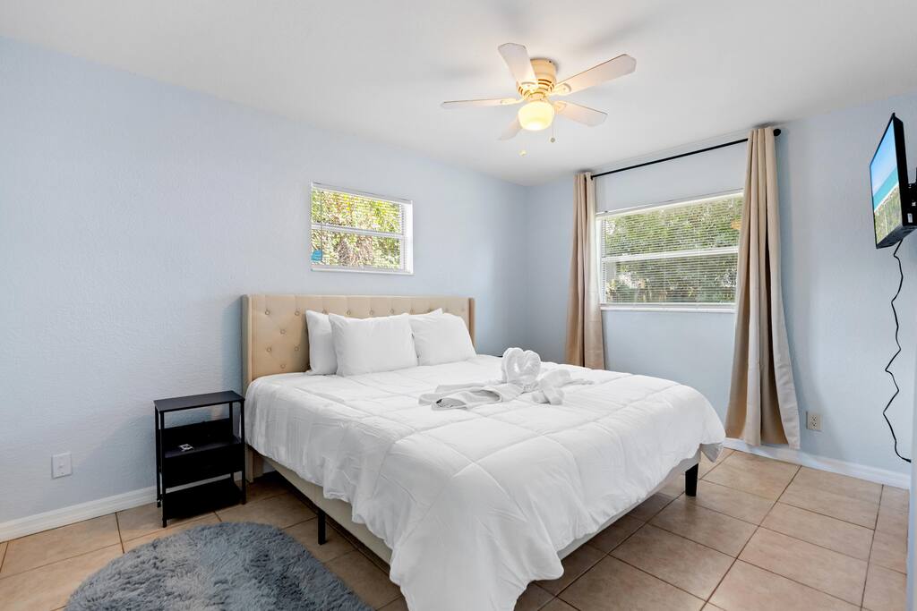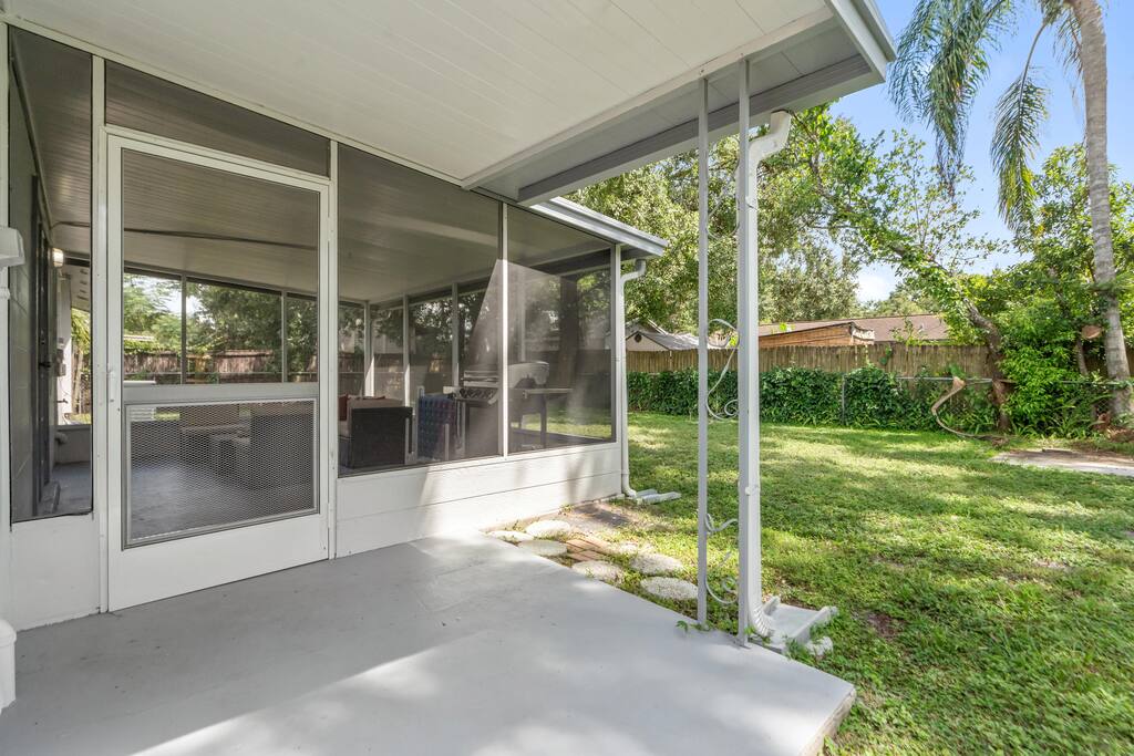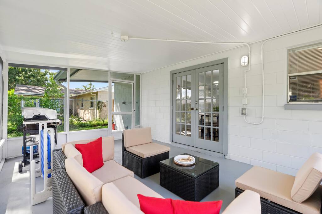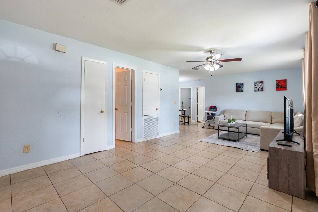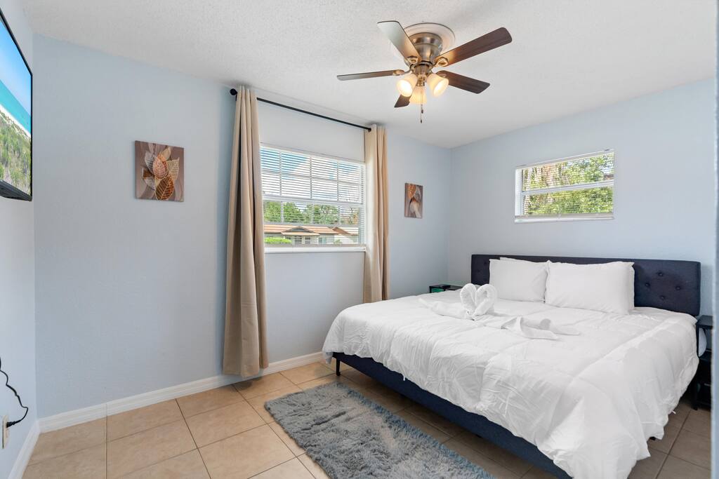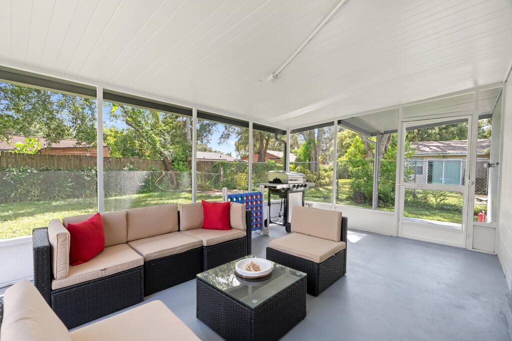 Welcome to this spacious Tampa retreat featuring three king bedrooms with smart TVs and a bunkbed room, comfortably sleeping up to eight guests. Enjoy a fully equipped kitchen, cozy living room with large smart TV, and high-speed internet throughout. The enclosed sunroom offers a BBQ grill, couch seating, and a Giant 4-in-a-Row Connect Game, while the private backyard and free driveway parking make your stay convenient and relaxing. Pets are welcome! Sleeping arrangements: •Bedroom #1 – King Bed (Sleeps 2) •Bedroom #2 – King Bed (Sleeps 2) •Bedroom #3 – King Bed (Sleeps 2) •Bedroom #4 – Bunkbed (Sleeps 2) The home is located in a quiet residential neighborhood, just minutes from Tampa’s most popular attractions. Busch Gardens is about a 13-minute drive, the University of South Florida is only 12 minutes away, and downtown Tampa and the Riverwalk can be reached in about 20 minutes. Florida’s Gulf Coast beaches are also a short drive away, making this home the perfect balance of comfort, convenience, and location.