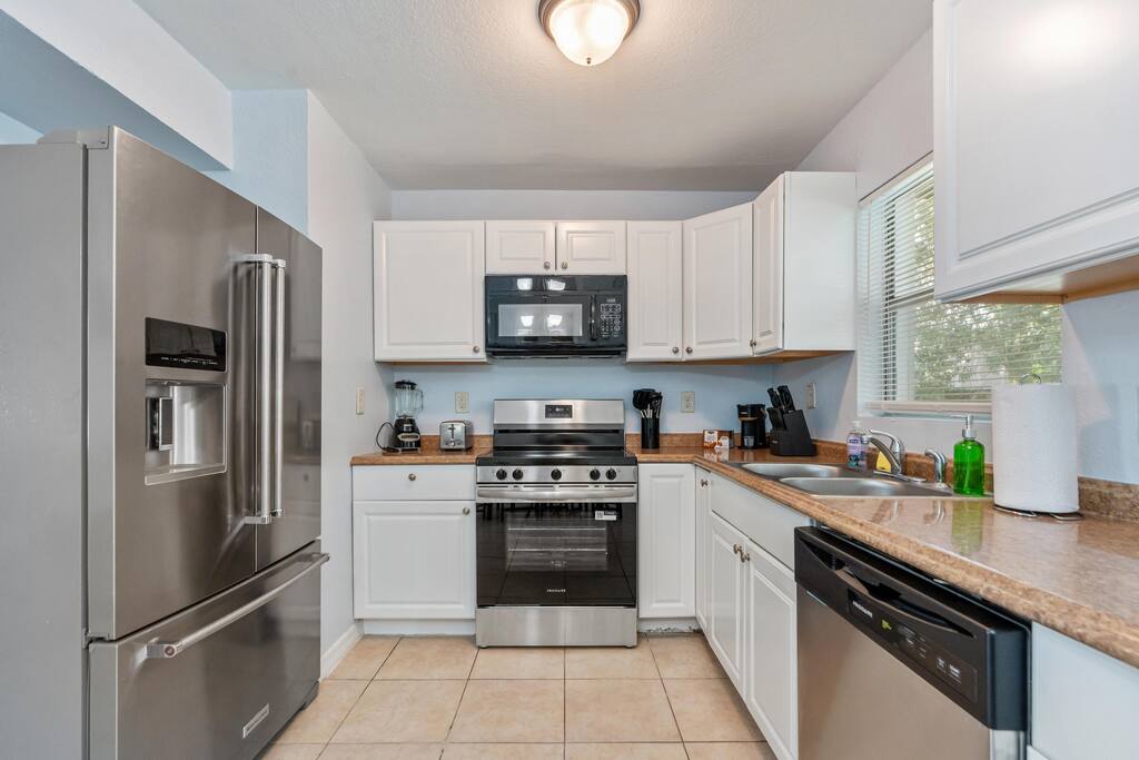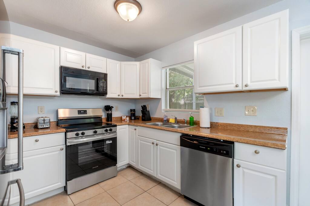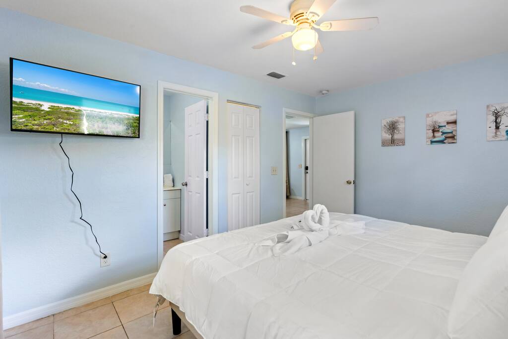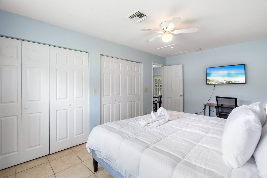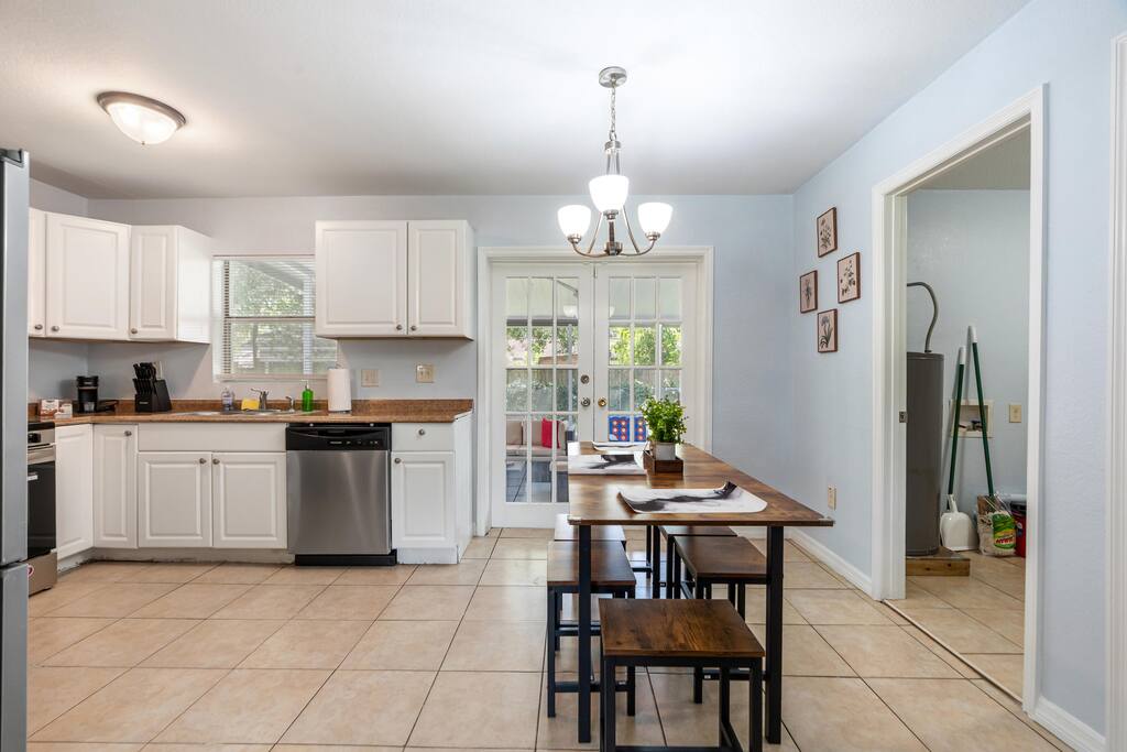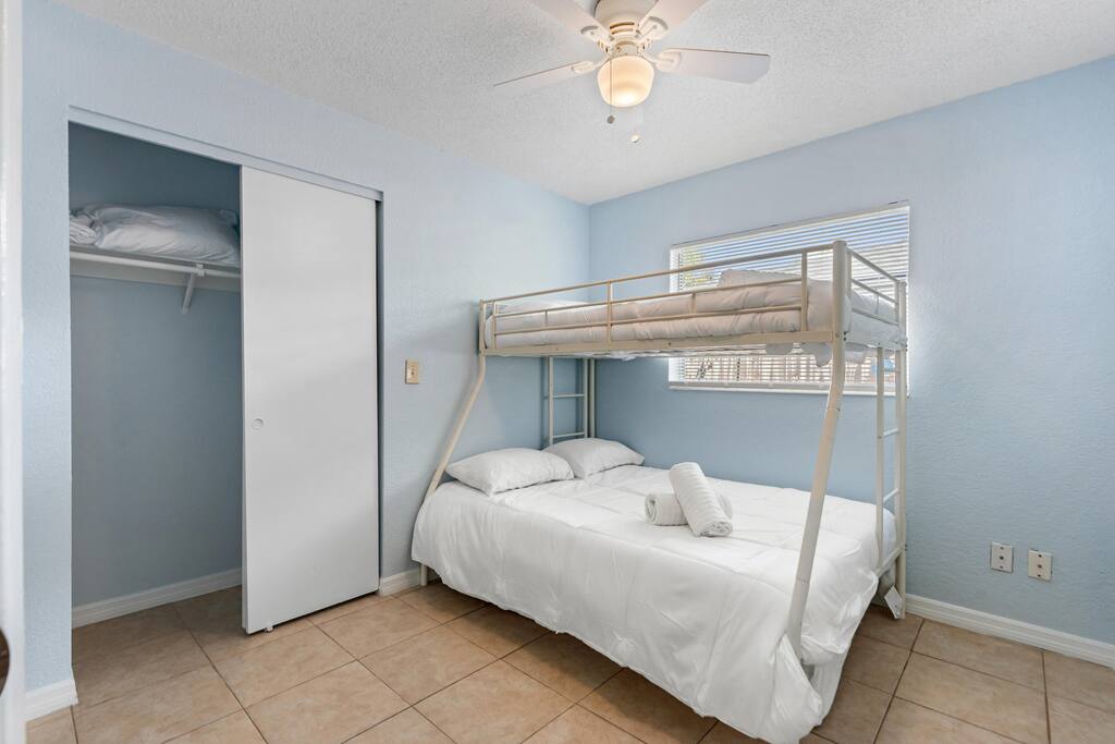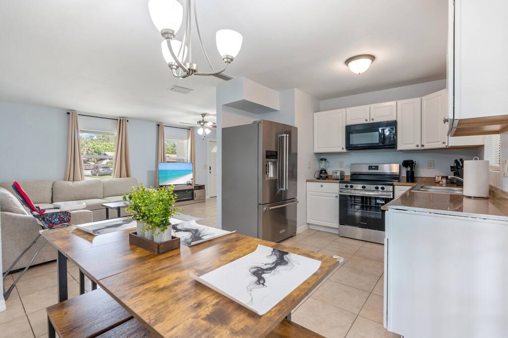 Welcome to this spacious Tampa retreat featuring three king bedrooms with smart TVs and a bunkbed room, comfortably sleeping up to eight guests. Enjoy a fully equipped kitchen, cozy living room with large smart TV, and high-speed internet throughout. The enclosed sunroom offers a BBQ grill, couch seating, and a Giant 4-in-a-Row Connect Game, while the private backyard and free driveway parking make your stay convenient and relaxing. Pets are welcome! Sleeping arrangements: •Bedroom #1 – King Bed (Sleeps 2) •Bedroom #2 – King Bed (Sleeps 2) •Bedroom #3 – King Bed (Sleeps 2) •Bedroom #4 – Bunkbed (Sleeps 2) The home is located in a quiet residential neighborhood, just minutes from Tampa’s most popular attractions. Busch Gardens is about a 13-minute drive, the University of South Florida is only 12 minutes away, and downtown Tampa and the Riverwalk can be reached in about 20 minutes. Florida’s Gulf Coast beaches are also a short drive away, making this home the perfect balance of comfort, convenience, and location.